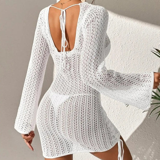 Siateczkowa krótka sukienka plażowa z długim rękawem Aquila